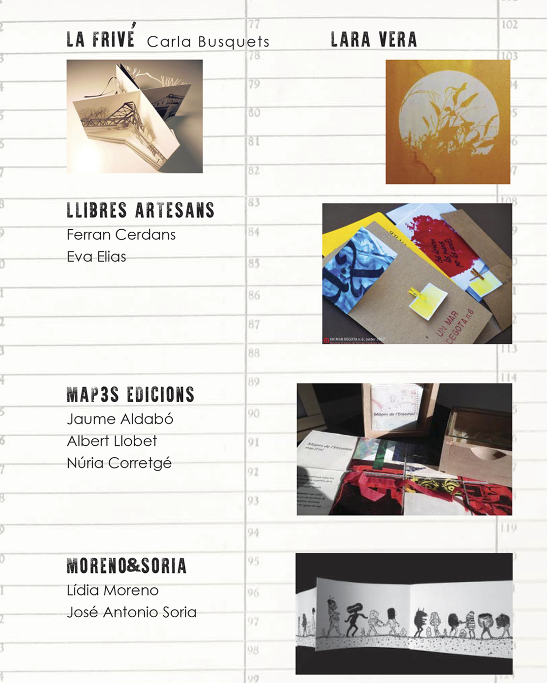 1+1=11 (ROBERTO EQUISOAIN) (ZARAGOZA) · AADR (ART ARCHITECTURE DESIGN RESEARCH) (MELBOURNE/MÁLAGA/PARÍS) · AKAL (MADRID) · AL-TIBA9 CONTEMPORARY (BARCELONA) · ALEJANDRA MORALES (BARCELONA) · ALIAS (CIUDAD DE MÉXICO) · AMAZINK PRINT STUDIO (MADRID) · AMAGATS (BARCELONA) · AMEN & CO (BARCELONA) · ANIMALES DE LORCA (VALENCIA) · ÀFRIQUES EDICIONS (BARCELONA) · AQC EDITORS (BARCELONA) · ARCADIA (BARCELONA) · ARCHIVEBOOKS (BERLÍN) · ARTE ESTAMPA (MADRID) · ARTLECTA (GUADALAJARA, MÈXICO) · ARTSLIBRIS SERIE AL (BARCELONA) · BENVENISTE CONTEMPORARY (MADRID) · BLUEPROJECT FOUNDATION (BARCELONA) · BONART (GIRONA/BARCELONA) · BRUNO TONINI (GUSSAGO) · CAJA NEGRA (BUENOS AIRES) · CASA DE VELÁZQUEZ (MzqADRID) · CASA FALCONIERI EDIZIONI (CAGLIARI) · CENDEAC – CARM (MURCIA) · CENTRE D´ART LA CAPELLA (BARCELONA) · CENTRO DE ARTE FUNDACIÓN MARÍA JOSÉ JOVE (A CORUÑA) · CÓMO SER FOTÓGRAFA (MADRID) · DACIL (BUENOS AIRES/MADRID) · DANIEL MUÑOZ RODRÍGUEZ (MADRID) · DISKO BOOKS (BARCELONA) · DXI PUBLICATIONS (VALENCIA) · EDICIONES VILASECO (A CORUÑA) · EL LOCAL (MADRID) · ENTRELAZANDO (CALI) · ESCIF (VALENCIA) · ESCUELA DE ARTE DE OVIEDO (OVIEDO) · ESPE PONS & JORDI JOVÉ (BARCELONA) · EVA PUJOL (GURB) · EXIT PUBLICACIONES (MADRID) · FABRA I COATS: CENTRE D’ART CONTEMPORANI (BARCELONA) · FIEBRE PHOTOBOOK (MADRID) · FONTANAR EDICIONES (SEGOVIA) · FUERADCARTA (MADRID) · FUNDACIÓ JOAN MIRÓ (BARCELONA) · FUNDACIÓ VILA CASAS (BARCELONA) · GALERÍA SENDA (BARCELONA) · GASPAR WAREHOUSE (BARCELONA) · GREYLOCK (NAVARRA) · INSTITUT DE CULTURA, AJUNTAMENT DE BARCELONA (BARCELONA) · KIT CANÍBAL (MADRID) · KUNSTHALLE LISSABON (LISBOA) · LA MALETA DE PORTBOU (BARCELONA) · LA NAVAL (CARTAGENA) · LA VIRREINA CENTRE DE LA IMATGE (BARCELONA) · LA ZÚA EDICIONES (CUENCA) · LANIPSEBOOKS (BARCELONA) · LAS CIERVAS (SEVILLA) · MACBA (BARCELONA) · METALES PESADOS (MADRID) · MIA MARTÍ (BARCELONA) · MIRALOOKBOOKS (MADRID) · MÓNICA MENA SANTOS (SEVILLA) · MORENO&SORIA (TERRASSA) · MORERA MUSEU D’ART MODERN I CONTEMPORANI DE LLEIDA (LLEIDA) · MOUSSE MAGAZINE AND PUBLISHING (MILÁN) · MUNDZIC (LONDRES) · MUSEO UNIVERSIDAD DE NAVARRA (PAMPLONA) · NIA DELFAU (BARCELONA) · NON FINITO (MADRID) · OGAMI PRESS (MADRID) · OJOS DE BUEY (BARCELONA) · PERDITA METABUK – SANDRA MARCH (BARCELONA) · PER(R)UCHO RISOGRAPH (VALENCIA) · RAIÑA LUPA (BARCELONA) · ROCIOSANTACRUZ (BARCELONA) · ROGA EDICIONES (CIUDAD DE MÉXICO) · SIRANDA (CIUDAD DE MÉXICO) · SUD SUD LISBOA (LISBOA) · SUMMA (MADRID) · TBA21. THYSSEN-BORNEMISZA ART CONTEMPORARY (MADRID) · TEMBLORES (CIUDAD DE MÉXICO) · TINTA INVISIBLE EDICIONS (BARCELONA) · TURNER (MADRID) · URUCUM (LISBOA) · VERTIZ PANI (CIUDAD DE MÉXICO) · XAVIER MANRIQUE (BARCELONA)